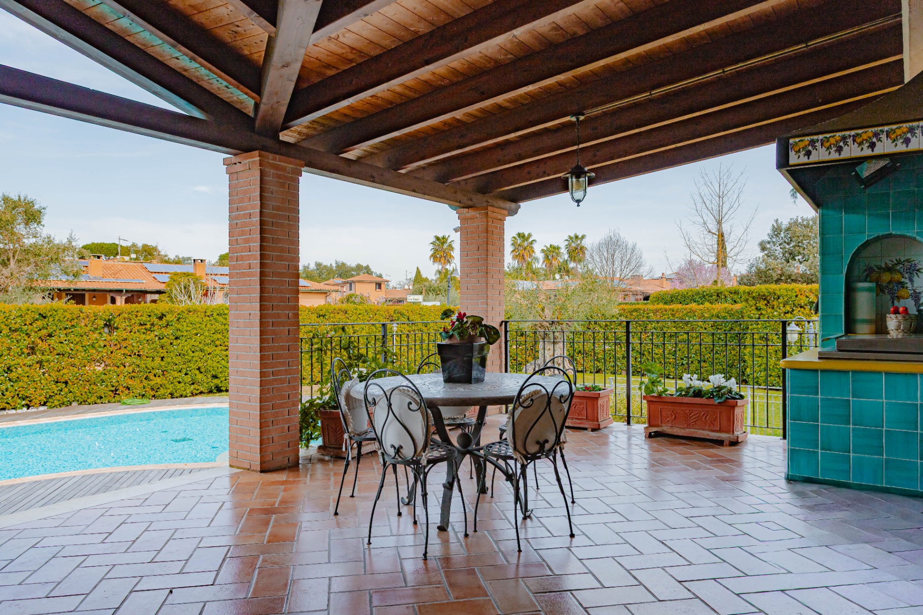 L'esterno è un'oasi di pace di circa 800 mq. Il giardino fa da cornice a una magnifica piscina dotata di zona idromassaggio, ideale per godersi la bella stagione nel massimo della riservatezza. Un'ampia e solida tettoia di 37 mq assicura un comodo ricovero per i propri autoveicoli.
